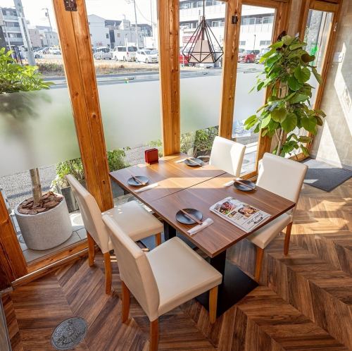 2名掛けのテーブル席はデートや友人との食事にぴったりの落ち着いた空間。木の温もりを感じるインテリアと、白を基調としたチェアが心地よさを演出します。自然光が差し込む明るい店内でゆったりと会話を楽しみながら、特別な時間を過ごせます。静かでプライベート感のある席なのでゆっくり過ごしたい方にもおすすめです。
